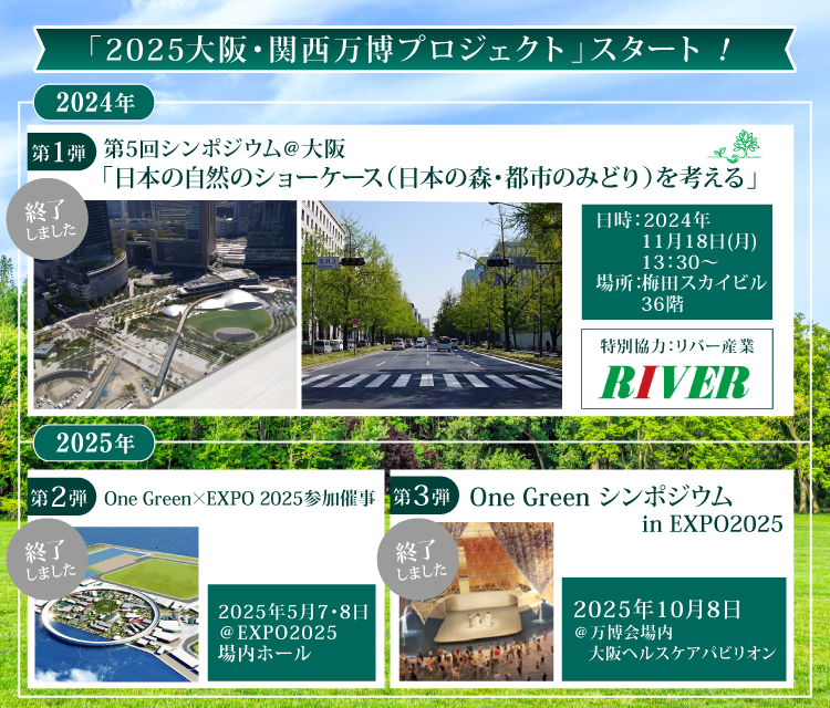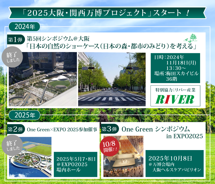近年多発する自然災害の低減、多様な生態系保護の重要性、コロナ後の新たなLife Styleの提唱、2025年大阪・関西万博における世界へ向けた情報発信など、私達と一緒に、今までにない取り組みを始めましょう。