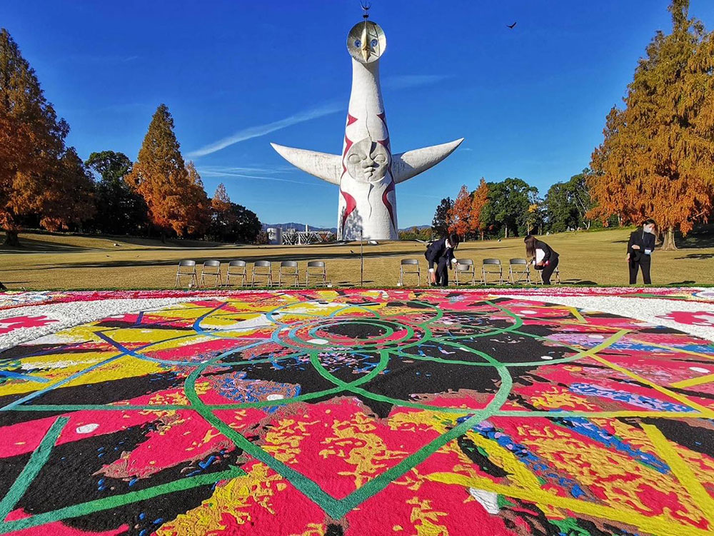今回のフラワーカーペットは地方自治体、民間企業など多くの皆様の支援、協力により開催されたが、特に約80名の関西大学、大阪大学の学生の皆様が一丸となって、日本屈指の花絵師 藤川 靖彦さんの指導の下に作成。